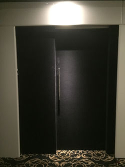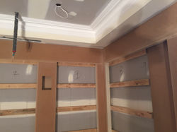 Satin white columns and Black Velour lined accustic panels, strategically placed around perimeter of cinema room to conceal internal window to the outside wall. Black velour floor to ceiling accustic panels slide and retract back to either side of window to allow natural light into the room for alternative entertaining.Fixed screen at the front of room, with black speaker fabric lined panels around perimeter, to allow the audio from the rear speakers behind screen. Slide show, build of cinema from vacant room to showtime!