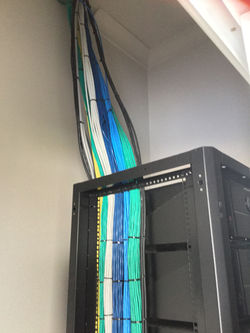 Timber grained laminated, floor to ceiling columns and grey accustic fabric lined panels, positioned strategically to conceal the room entry double doors, and sliding bifold door to the outside. 2700mm high x 3800mm wide accusticly panelled sliding door retracts back towards the rear of the room, to the side of seating platform to reveal outside bifold doors for natural light into room. Screen audio speakers sitting on fixed shelves behind perforated fabric screen, with black fabric lined panels around the perimeter.